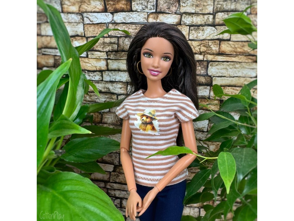 Méďa v klobouku - tričko pro Barbie, hnědé proužky